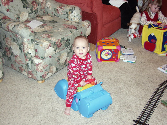 Jacob sits on Hippo toy vacuum.