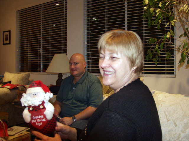 Grandma shows Jacob new Santa Grandpa and JD looks on.